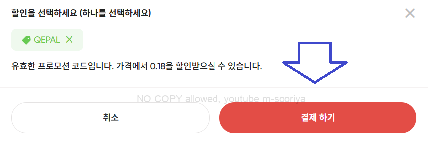다만 위 금액은 할인코드를 적용하신 경우에 해당하니, [프로모션 코드나 쿠폰이 있나요?]를 클릭하신 후 QEPAL을 입력하시고 [적용] 버튼을 눌러주시면 됩니다.