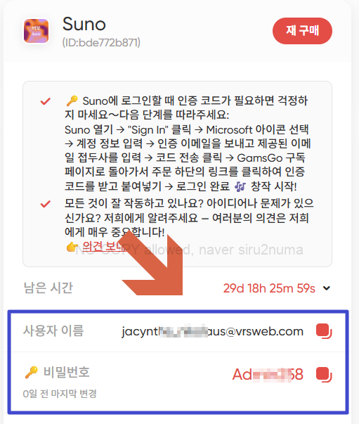 suno에 할당된 계정을 복사해 두시기 바랍니다.