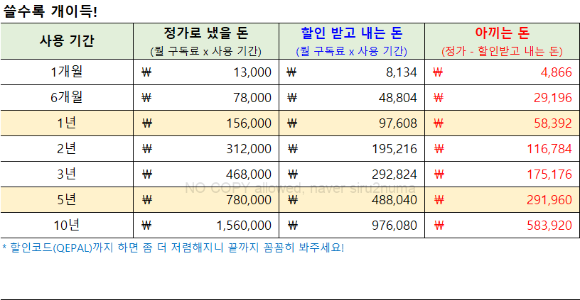 이렇게 하시면 정가 14,000원에 비해 매달 5,800원을 절약하실 수 있고, 1년이면 58,000원, 5년간은 29만원까지 아끼실 수 있습니다.